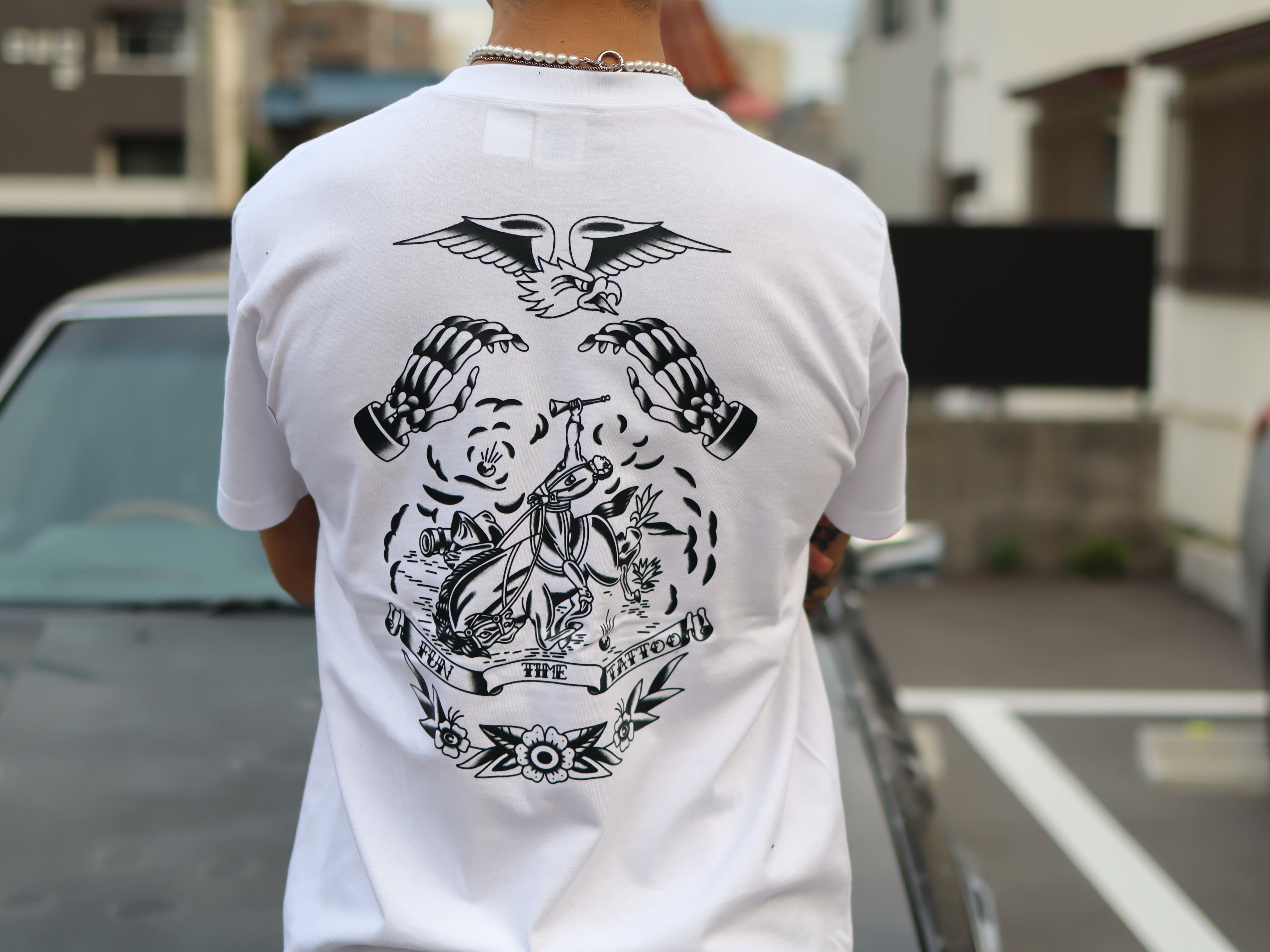 フロント/バックに、彫師 “HORIRYU” 氏による “トラディショナル・タトゥー(Old School)” スタイルのグラフィックを配置。太めのアウトライン、鮮やかな発色、クラシカルなモチーフが特徴です。